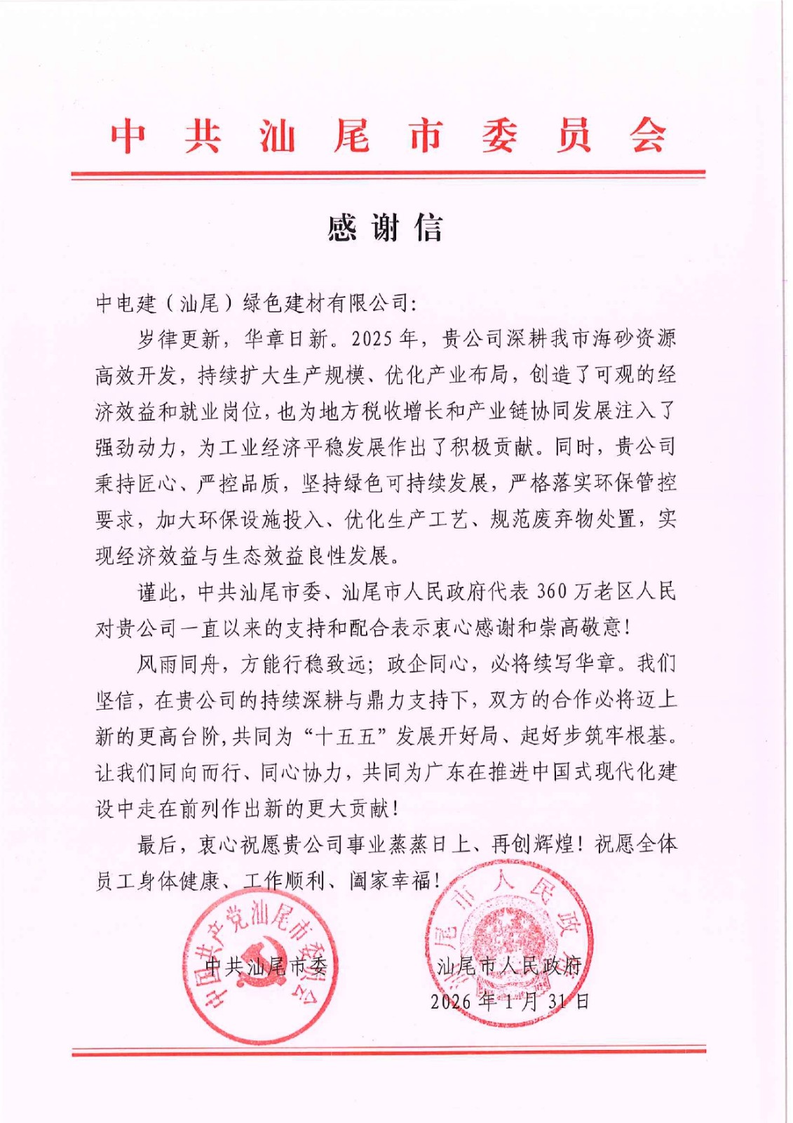 近日,汕尾项目收到中共汕尾市委、汕尾市人民政府发来的感谢信。信中高度肯定了项目公司2025年在海砂资源开发、地方经济发展和绿色可持续发展等方面作出的突出贡献,并代表360万老区人民致以衷心感谢和崇高敬意。这封感谢信既是政企携手、同频共振的生动见证,也是对汕尾项目高质量发展成效的有力印证。