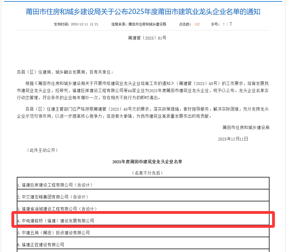日前,莆田市住房和城乡建设局公布了2025年度莆田市建筑业龙头企业评选结果。中电建路桥(福建)建设发展有限公司(以下简称“福建公司”)凭借扎实的综合实力和稳健的市场表现,成功入选。