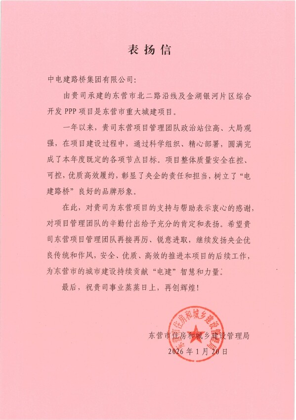 表扬信指出,东营项目团队政治站位高、大局观强,在项目建设过程中,通过科学组织、精心部署,圆满完成2025年度既定各项节点目标,项目整体质量安全在控、可控,实现了优质高效履约,彰显央企的责任和担当,树立了“中国电建路桥”良好品牌形象。