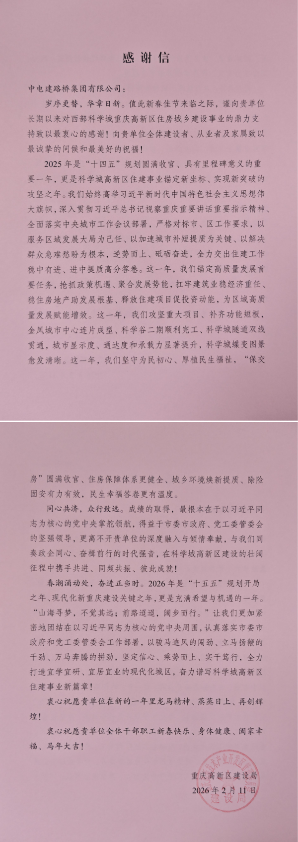 新春佳节来临之际,公司收到重庆高新区建设局发来的感谢信。信中,重庆高新区建设局对公司长期以来在西部科学城重庆高新区住房城乡建设事业中的鼎力支持致以衷心感谢,并向全体建设者及家属送上节日问候。