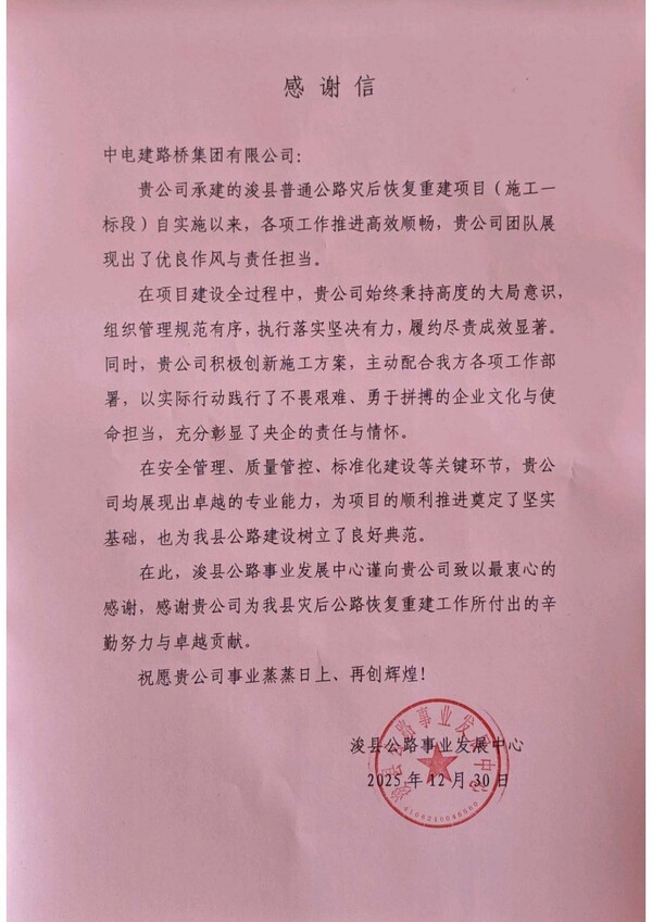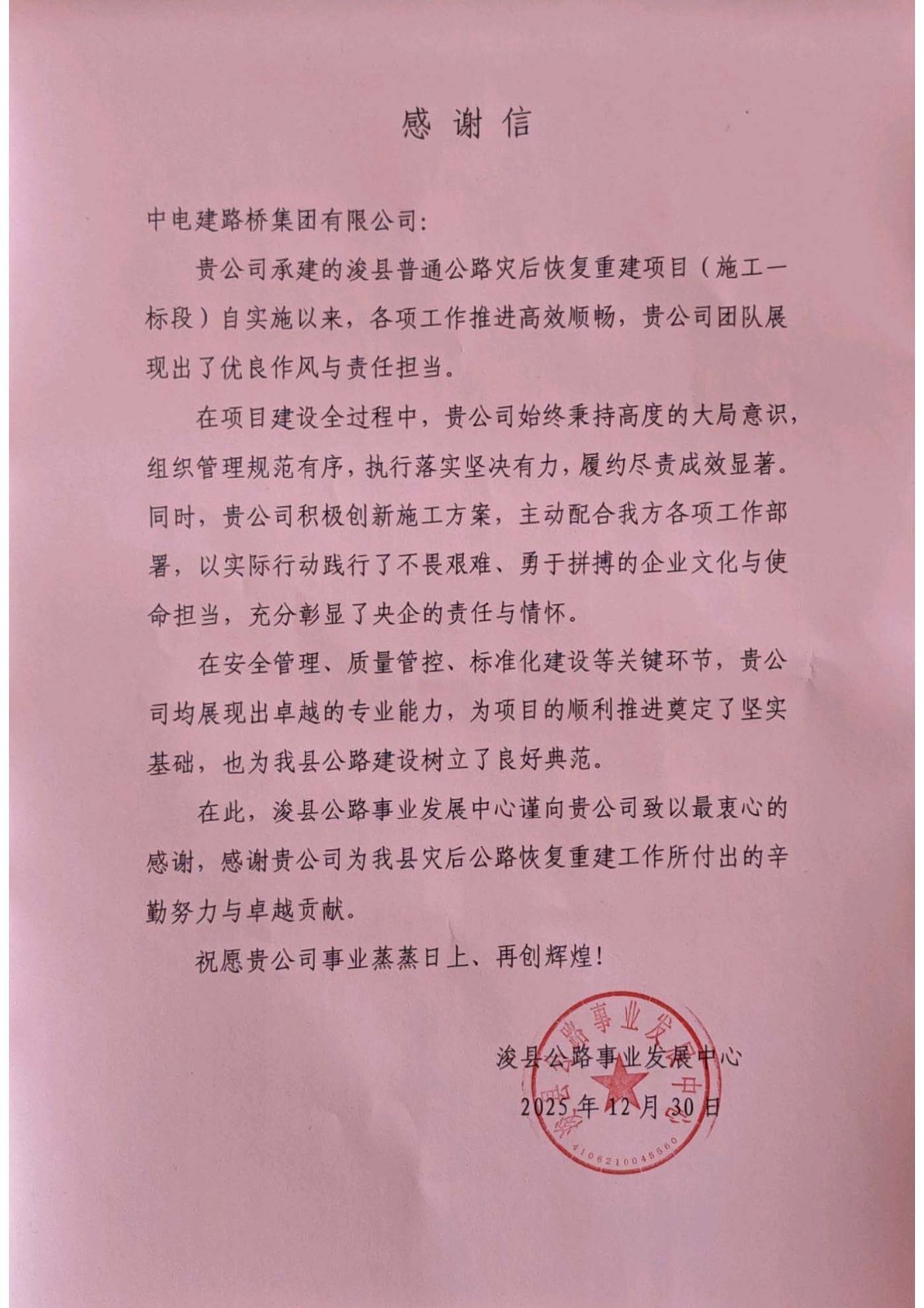 近日,浚县公路事业发展中心向电建路桥公司发来感谢信,对浚县普通公路灾后恢复重建项目(施工一标段)(以下简称:浚县灾后重建项目)建设过程中展现出的专业水准、责任担当、履约能力和优良作风给予高度肯定,并对全体参建人员的辛勤付出致以诚挚感谢。