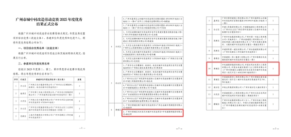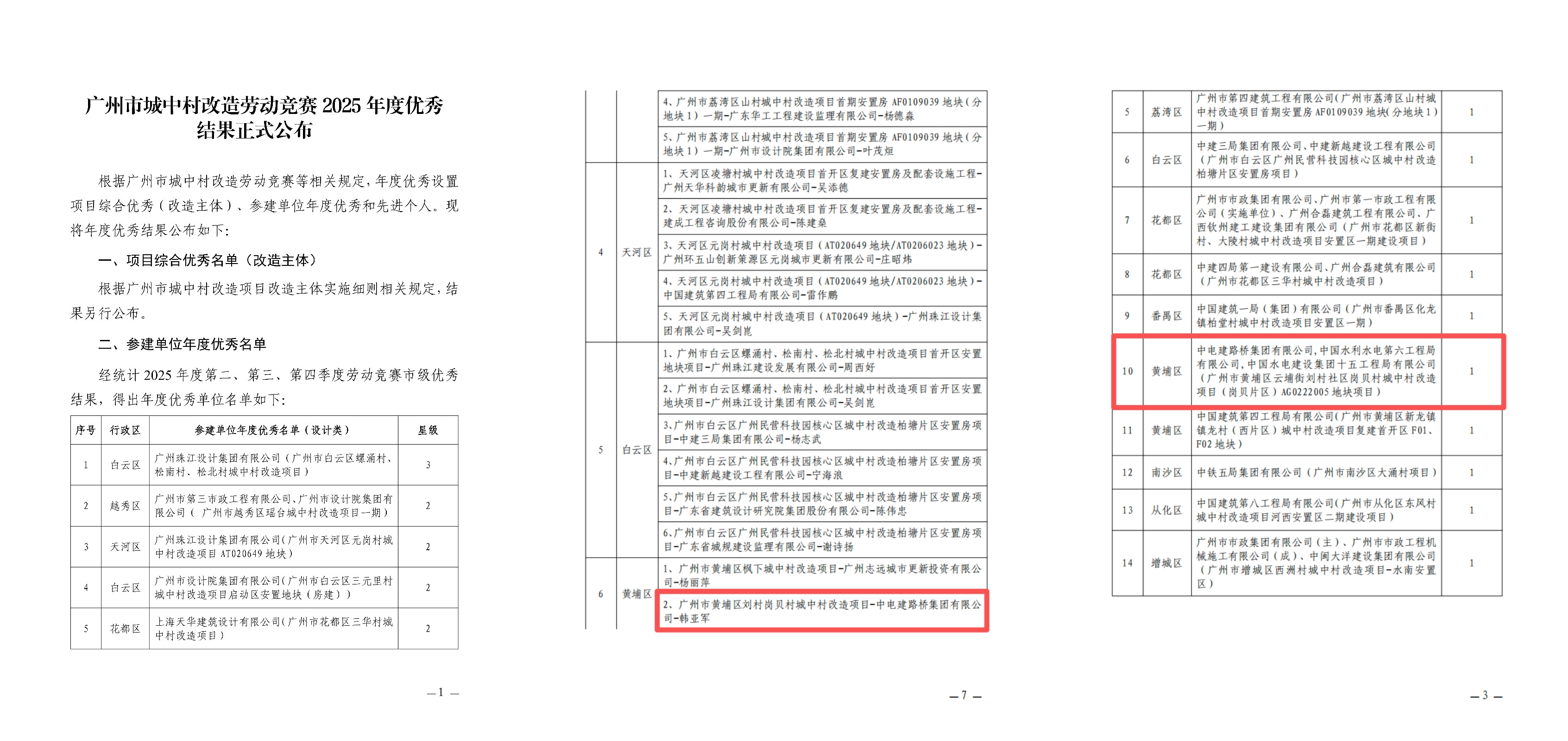 近日,路桥公司联合水电六局、水电十五局承建的广州市黄埔区云埔街刘村社区岗贝村城中村改造项目,在2025年度广州市城中村改造劳动竞赛评选中脱颖而出,荣获施工类年度优秀单位(1星级)。此前,项目已连续在第二、三、四季度市级劳动竞赛中获评优秀,为年度摘奖奠定坚实基础,充分彰显了公司在城市更新领域的综合实力与品牌影响力。