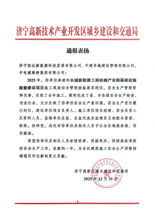 济宁项目始终坚守央企担当,以严谨的施工管理、优质的工程质量与积极的社会责任践行,赢得政府部门高度认可,收到济宁高新区城乡建设和交通局表扬信。表扬信中对项目在推进地方建设、保障工程安全质量、配合区域发展等方面的努力与成效给予充分肯定,认为项目为地方建筑行业高质量发展作出了积极贡献,是政企协同推进工程建设的优秀范例。