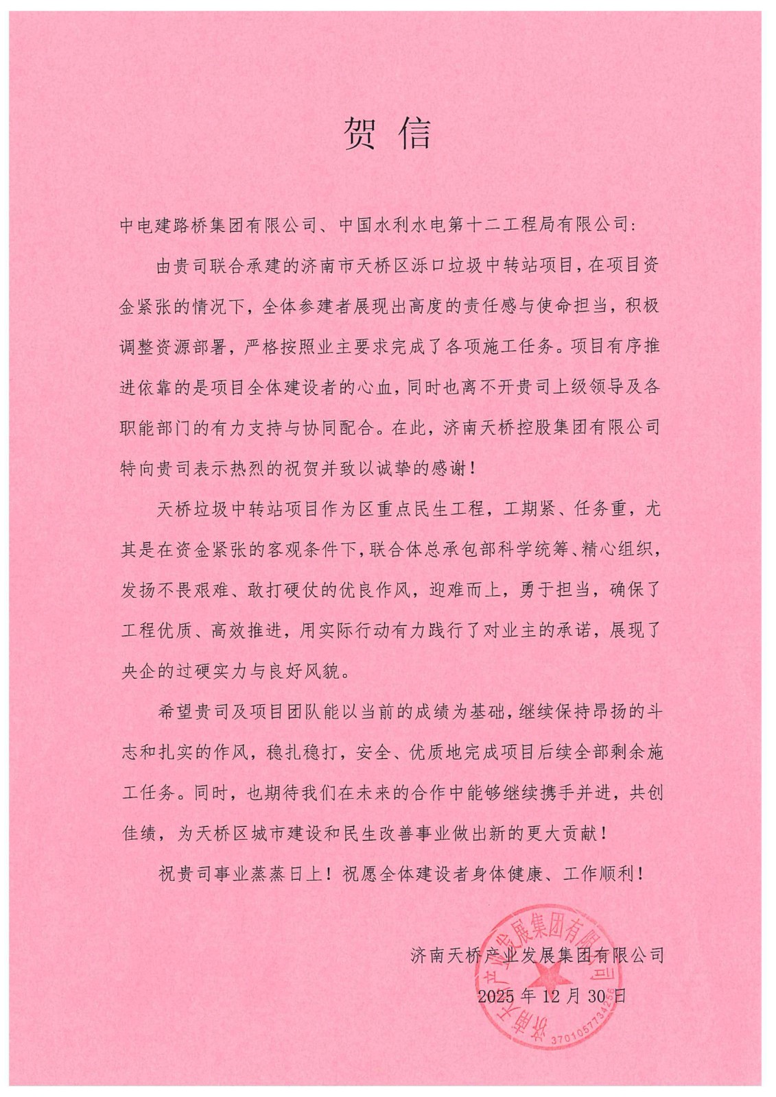 近日,公司收到济南市天桥区泺口垃圾中转站项目建设单位济南天桥产业发展集团有限公司发来的贺信,对项目优质高效推进工程建设予以充分肯定,对公司所展现的央企责任担当表示感谢。