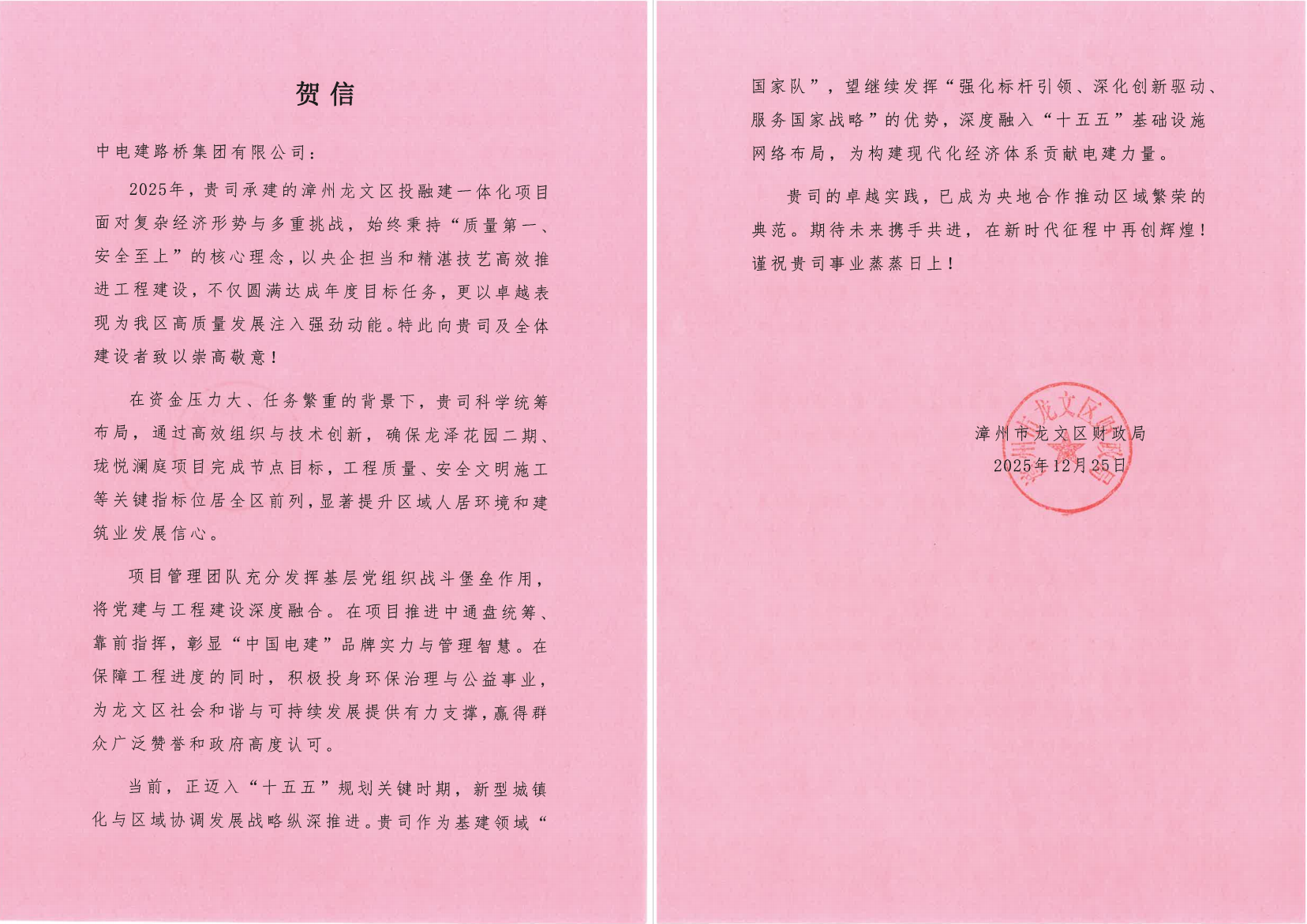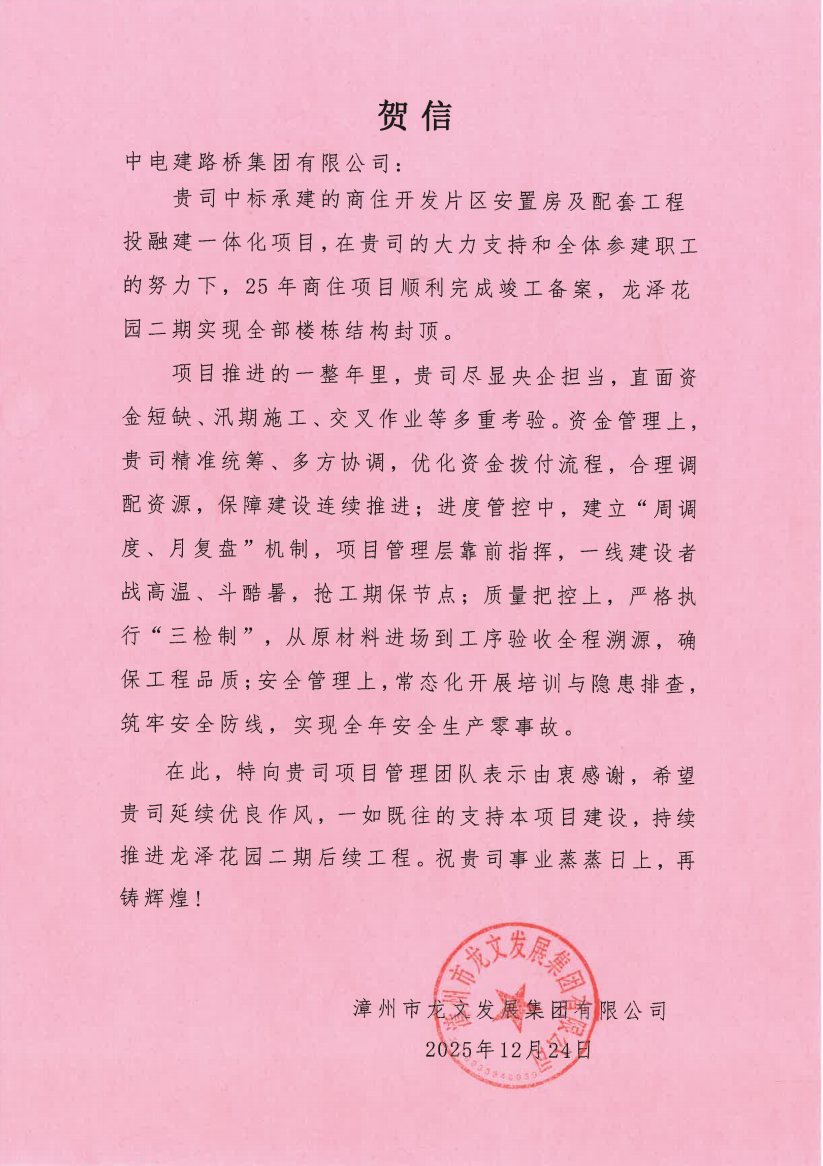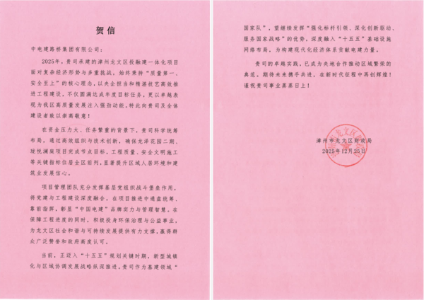 两份贺信均对路桥公司项目管理团队的专业素养、奉献精神及品牌实力表示由衷感谢与崇高敬意,并希望公司能延续优良作风,在“十五五”新征程中继续发挥标杆引领作用,为地方经济社会高质量发展贡献更多力量。