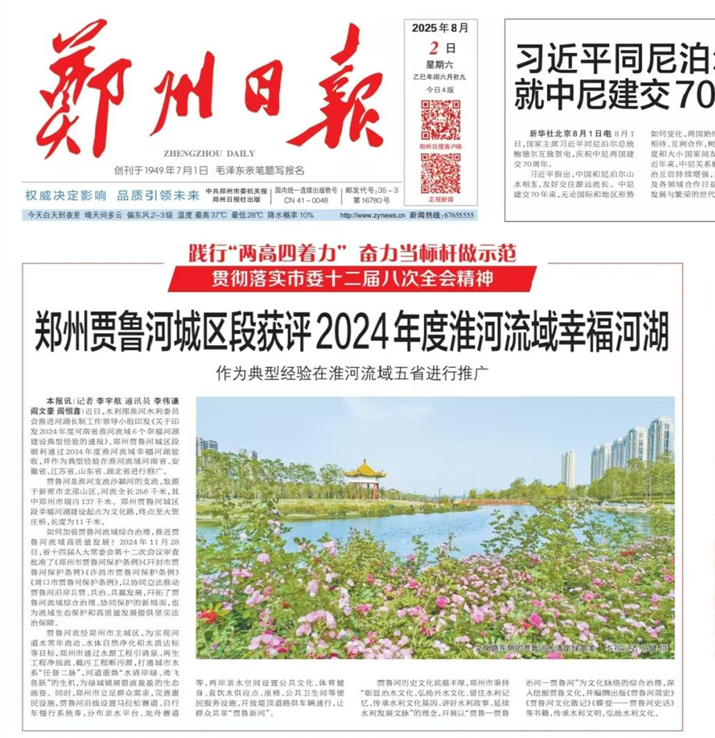 8月2日,《郑州日报》头版头条刊发了“郑州贾鲁河城区段获评2024年度淮河流域幸福河湖”的报道。公司投资建设的郑州市贾鲁河综合治理工程,荣获水利部淮河水利委员会“河南省2024年度淮河流域幸福河湖”,并作为典型经验在淮河流域河南省、安徽省、江苏省、山东省、湖北省进行推广。