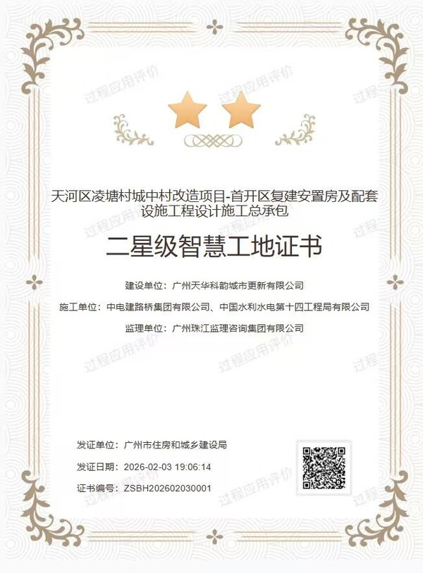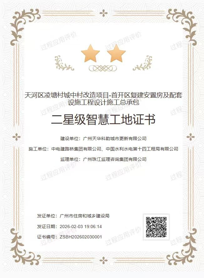 近日,由电建路桥公司牵头承建的天河区凌塘村城中村改造项目首开区复建安置房及配套设施工程,荣获广州市住房和城乡建设局颁发的“二星级智慧工地”证书。该荣誉充分彰显了项目在数字化建造、安全管控和绿色施工等方面取得的阶段性成果,标志着项目在智慧建造与可持续发展方面迈上新台阶。