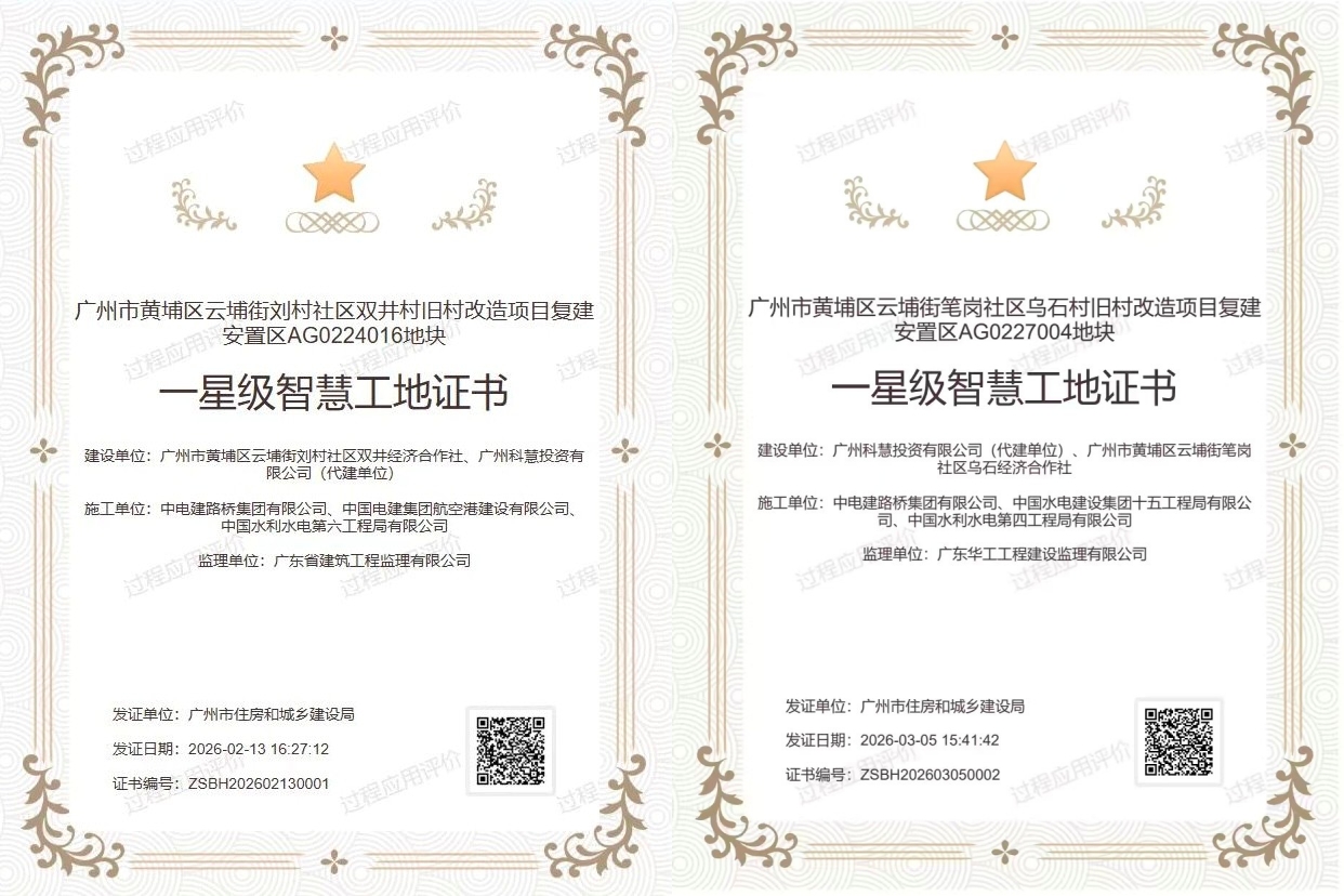 近日,电建路桥公司黄埔科投项目群总承包部乌石村旧村改造项目、双井村旧村改造项目顺利通过广州市住房和城乡建设局智慧工地综合评审,成功获评广州市一星级智慧工地,标志着项目智慧化建设与数字化管理水平迈上新台阶,为黄埔区旧村改造领域树立智慧建造新标杆。